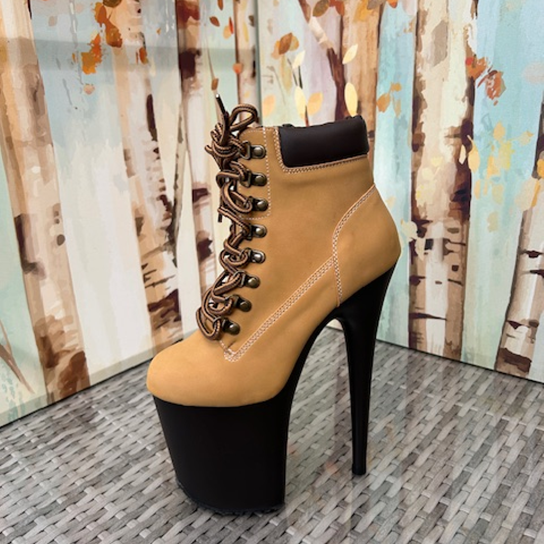 Botín con cordones en la parte delantera, tacón de 200 mm (8") y plataforma de 100 mm (4"). Cuello acolchado, suela de goma con tacos y cierre de cremallera en el interior.